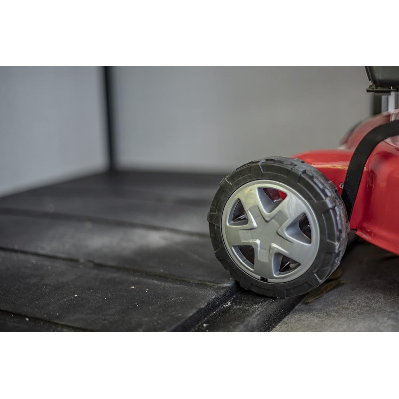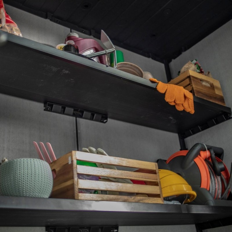 Der Kleiderschrank ist mit einer zweiflügeligen Tür ausgestattet, die den Zugang auch für sperrige Gegenstände erleichtert, einem Boden aus hochfestem Kunstharz und einem Dach mit Stahlrahmen.