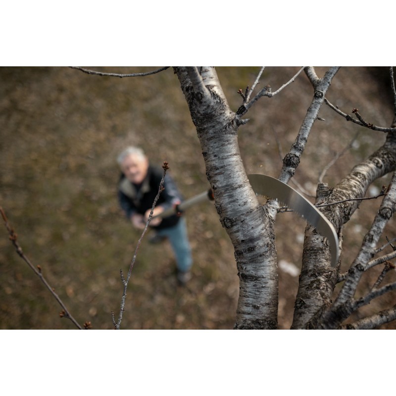 L'intercapedine posta ogni 10 cm tra i denti della lama favorisce lo scarico della segatura, per una maggiore efficenza durante il lavoro. Il trattamento dei denti ad impulsi termici garantisce una lunga durata della lama e tagli puliti e precisi. La lama a gancio posta all'estremità superiore del seghetto assicura una rapida rimozione dei rami più sottili e un accesso più agevole alla chioma.