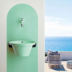 Dekorativer Wandbrunnen aus Stahl, komplett mit Wasserhahn, passender Vase, Vasenständer und Beschlägen. Erhältlich in vier Farben. Vasenmaße: 32 x 32 x 16 cm (L x B x H).