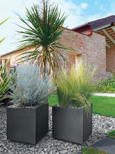 Unsere Vasen bestehen aus einem speziellen Polymer, das sie UV-beständig und leicht zu reinigen macht.