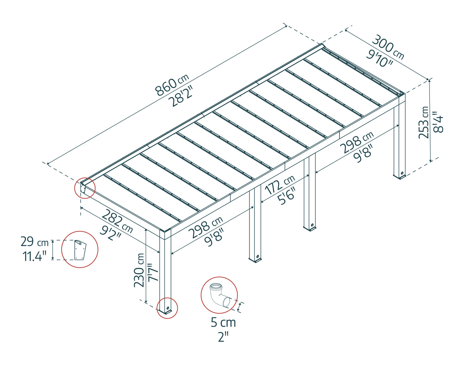 Entdecken Sie die Helsinki Canopia Pergola 3 x 8,6 m aus hochwertigem Zedernholz. Diese langlebige, pflegeleichte Terrassenüberdachung bietet eine perfekte Balance zwischen Funktionalität und Schönheit. Mit seinem modernen und minimalistischen Design schafft es eine einladende Atmosphäre für Ihren Außenbereich. Ausgestattet mit Solar Control-Dachpaneelen und integrierten Dachrinnen können Sie Ihren Außenbereich zu jeder Jahreszeit genießen. Es ist einfach zu installieren und zu warten und die ideale Ergänzung für Ihren Garten.