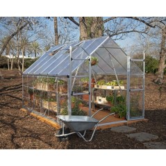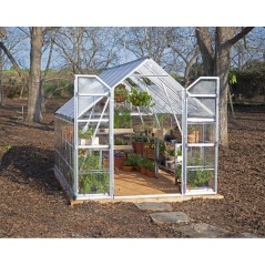 When we tell you that Palram - Canopia Balance greenhouse kits provide your plants with optimal conditions for nourishment and growth, we mean it. With two types of glazing, you get a balanced DIY greenhouse that combines the protection of diffuse double-wall roof panels with the light transmission of crystal-clear wall panels for ideal growing conditions. All panels are made of UV-protected polycarbonate, a high-end glass-like and virtually unbreakable polymer that is particularly suited to greenhouses. The extra-large working area gives you ample space to grow an abundance of vegetables and herbs and to store the tools and accessories you need. The Balance greenhouse is also extremely accessible with large double doors and a low threshold for wheelbarrows to enter and exit and enough space to transfer large plant boxes. The combination of the safe polycarbonate panels with the rust-resistant aluminum frame and extra strong support beams provides you with a well-designed and durable greenhouse, so you never have to worry about the strength or safety of your greenhouse. For a beautiful, well-designed and spacious addition to your gardening experience, purchase a Balance backyard greenhouse today! - Polycarbonate: 100% UV protected, virtually shatterproof and will not yellow or become brittle over time
