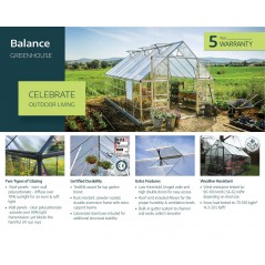When we tell you that Palram - Canopia Balance greenhouse kits provide your plants with optimal conditions for nutrition and growth, we mean it. With two types of glazing, you get a balanced DIY greenhouse that combines the protection of diffuse double-wall roof panels with the light transmission of crystal-clear wall panels for ideal growing conditions. All panels are made of UV-protected polycarbonate, a high-end glass-like and virtually unbreakable polymer that is particularly suited to greenhouses. The extra-large working area gives you ample space to grow an abundance of vegetables and herbs and to store the tools and accessories you need. The Balance greenhouse is also extremely accessible with large double doors and a low threshold for wheelbarrows to enter and exit and enough space to transfer large plant boxes. The combination of the safe polycarbonate panels with the rust-resistant aluminum frame and extra strong support beams provides you with a well-designed and durable greenhouse, so you never have to worry about the strength or safety of your greenhouse. For a beautiful, well-designed and spacious addition to your gardening experience, purchase a Balance backyard greenhouse today! - Polycarbonate: 100% UV protected, virtually shatterproof and will not yellow or become brittle over time
