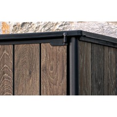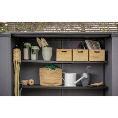 The Vertical outdoor tool shed combines strength and practicality. With a 1400L capacity, it conveniently stores tools, bicycles, and more. The 110° opening metal hinges provide easy access, while two shelves and a ramped floor make organizing even easier. The lockable door ensures security, and its UV resistance makes it perfect for all seasons. Easy to assemble, it's the ideal choice for optimizing and protecting your outdoor space.