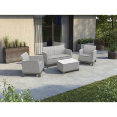 Set consisting of: 2 armchairs with open armrests, 1 storage table and 1 sofa.