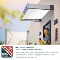 Sophia XL is the epitome of modern style and functionality - our extra wide and deep door awning is a chic solution to elevate your home.chic solution to elevate your home. Crafted with precision, this contemporary awning offers ample protection that goes beyond standard dimensions (literally, at over 1.4 meters deep).that goes beyond standard dimensions (literally, at over 1.4 meters deep , it is deeper than most door covers).Designed to impress, our door awnings can be installed seamlessly next to each other to add coverage to your rear patio, entryway, windows or even above the garage door. The elegant lines and minimalist design of the gray aluminum structure with transparent panels create a visually stunning addition to your home, providing a welcoming entrance for both residents and guests.a welcoming entrance for both residents and guests .This ultra-durable awning is easy to install and designed to withstand the harshest weather conditions, so you, your belongings and your door are protected, your belongings and your door are protected for years to come. With the Sophia XL door awning, you will get the protection you needprotection you need with the look you want.