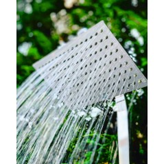 Triangular outdoor shower for surface installation, complete with adjustable anti-limescale shower head, manual mixer for hot and cold water, stainless steel mounting base and screws. Available in four colors.