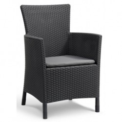Rattan texture, seat cushions included.