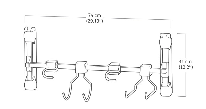 Kit para organizar el espacio en el interior de casas Keter (excluyendo línea Factor). Equipado con 4 ganchos para colgar objetos (por ejemplo mango de herramientas como escobas, rastrillos, palas). Estructura metálica.