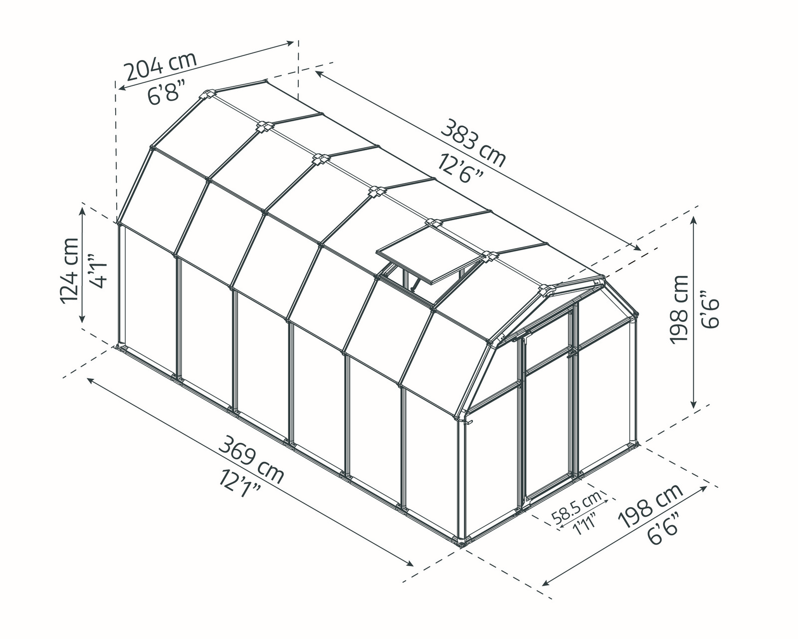 El invernadero Palram - Canopia Eco Grow es la opción clásica para los cultivadores de invernadero. Diseñado con forma de granero, este invernadero DIY ofrece un diseño clásico, un espacio cómodo y un aislamiento térmico superior. La puerta batiente simple se puede instalar tanto a la izquierda como a la derecha y se mantiene abierta fácilmente gracias al cierre magnético. La ventilación del techo permite controlar la temperatura y la humedad incluso con la puerta cerrada. Para mejorar aún más el control de la temperatura, cuenta con tiras de sellado de goma y un resistente marco de resina con protección UV que proporciona un mejor aislamiento. Sus plantas estarán protegidas tanto de las inclemencias del tiempo como del sol gracias a los paneles del techo de policarbonato de doble pared de 4 mm, prácticamente irrompibles, y los paneles laterales de doble pared de 6 mm, que bloquean los dañinos rayos UV y difunden más del 80 % de la luz solar para una luz suave y uniforme. ¡Montarlo es muy fácil! El marco de resina resistente a la intemperie utiliza un sencillo sistema de montaje con pasador y cerradura; simplemente deslice los paneles en su lugar. ¡El invernadero Eco Grow es perfecto para las necesidades del cultivador aficionado! ¡Empiece a cultivar hoy mismo!