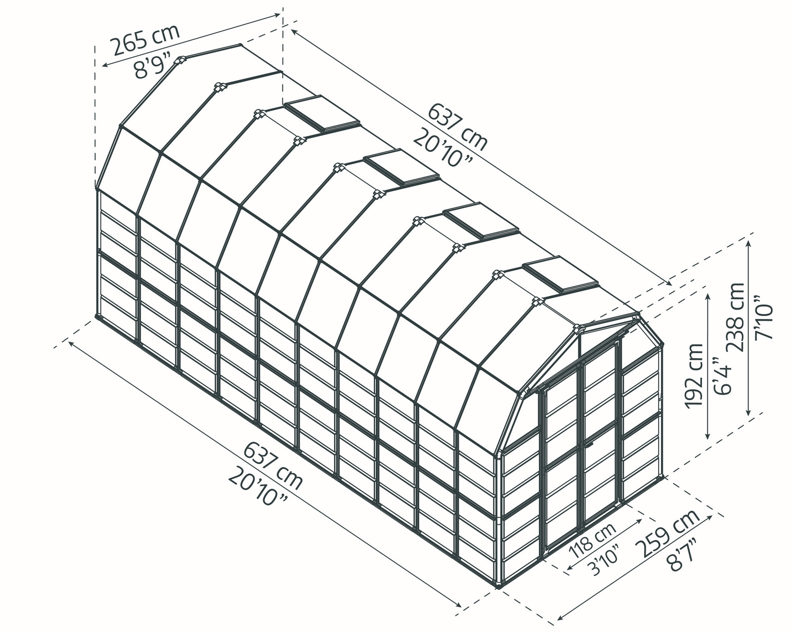 Descubra el invernadero híbrido Grand Gardener de Canopia, una joya de diseño y funcionalidad. Con su elegante estilo de granero y su robusta estructura de resina resistente a la intemperie, ofrece un entorno ideal para sus plantas. Los paneles de policarbonato difunden más del 80 % de la luz solar, garantizando un crecimiento equilibrado. Amplio espacio interior, puertas dobles para un fácil acceso y una ventilación óptima. Resistente a la nieve y al viento. Fácil de montar. Dimensiones: 637 x 265 x 238 cm.
