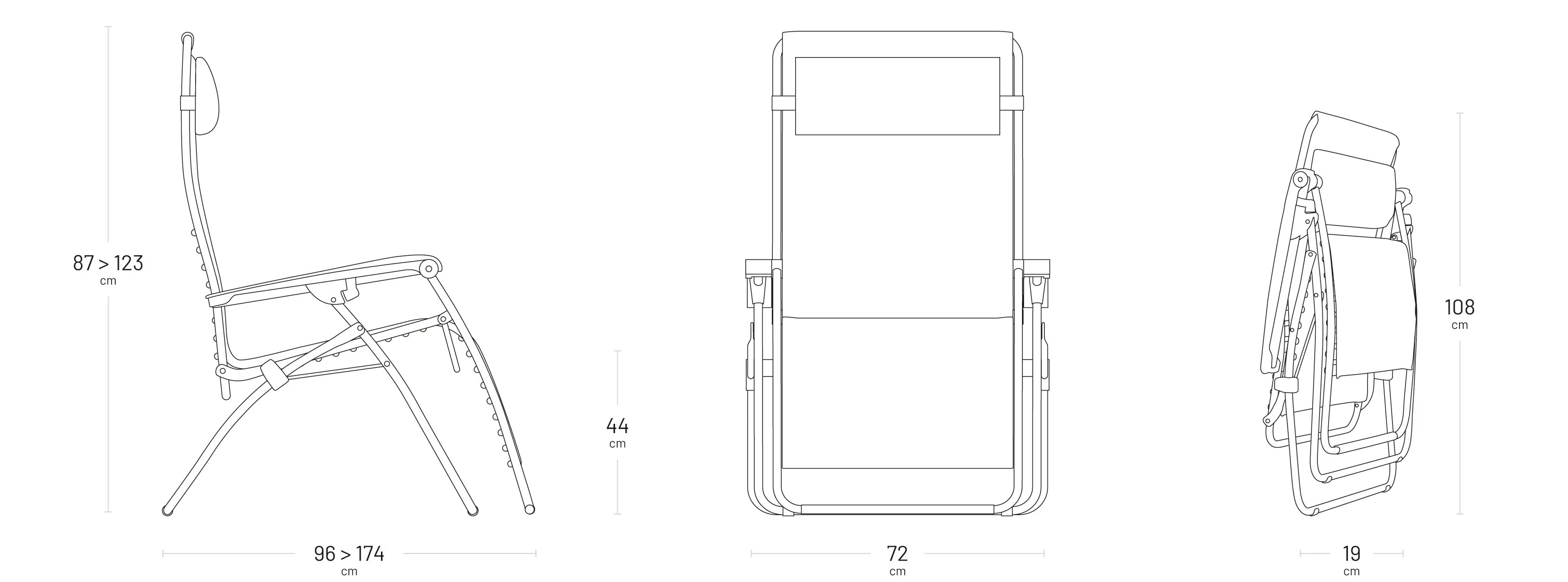 - Lona: Batyline® ISO. Lona extraíble y reemplazable con fijación mediante clip de elastómero (patente LAFUMA MOBILIER).