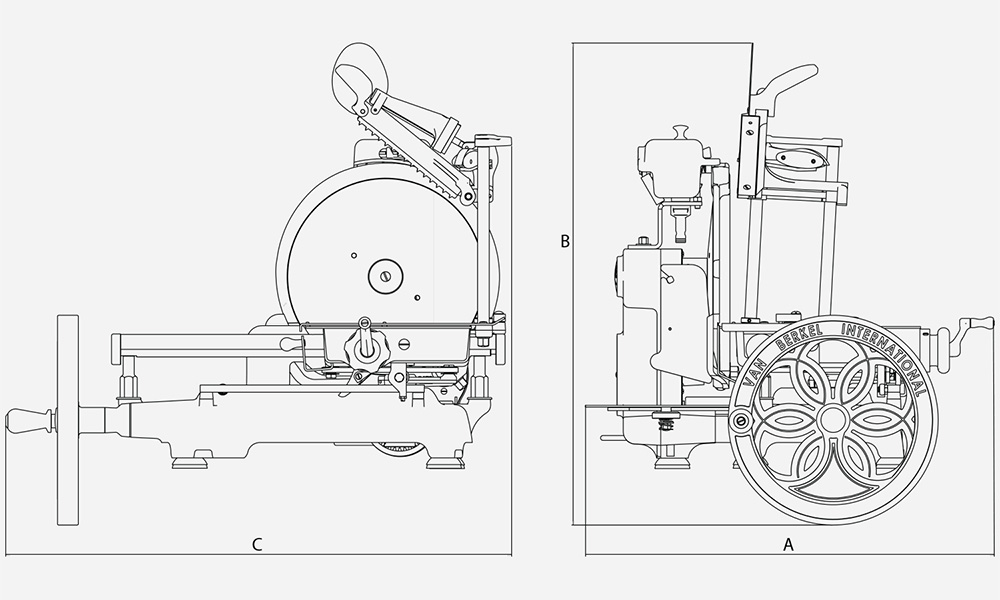 Flywheel slicer B114 for delicatessen, suitable for all types of cured meats. Equipped with a 31.9 cm blade, it is made of painted aluminum with stainless steel details.