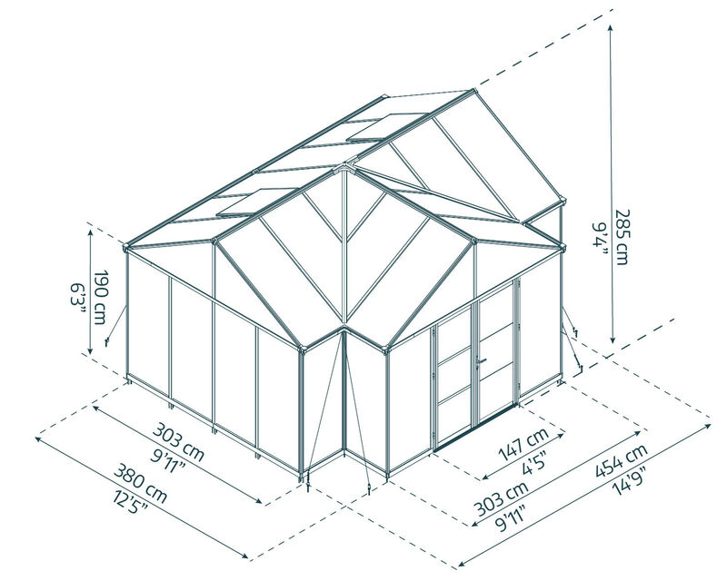 Inspired by the idea of merging garden, home and outdoor lifestyle, take a closer look at your backyard as a place of refuge with the Triomphe Garden Chalet. The sturdy T-shaped Orangery has high side walls and vaulted ceilings giving you over 9 feet of height and a generous layout with enough space to create a truly enjoyable outdoor experience. Large enough for a dining table to share meals with the ones you love or a lounge area with comfortable seating to escape from everyday stresses, the Triomphe is designed to extend and elevate your living space. With lighting and heating available to purchase separately, you can create an inviting environment that you'll want to use all year round. Breathe in the atmosphere with two large automated skylights and double doors that open and close easily, providing an abundance of air flow. Doors can be added on the front or side to fit your space and needs. Solid acrylic glass reduces outside noise and is exceptionally safe, creating a cozy private space for you and your family that you can rely on. The aluminum frame has a sleek black finish and is durable enough to hold shelves anywhere indoors of your greenhouse for plants, decorations, books or even outdoor tableware. The Triomphe is virtually maintenance free, leaving you to relax, enjoy and celebrate every day.