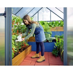 The Mythos greenhouse is particularly elegant. It helps maintain optimal temperature and light for sensitive plants. Featuring virtually indestructible double polycarbonate panels and a powder-coated stainless aluminum frame. Mythos offers a magnetic lockable door, roof vent and galvanized steel base for stability, alignment and height. The Mythos greenhouse is elegant and practical, designed to protect plants from the elements so you can garden all year round.
