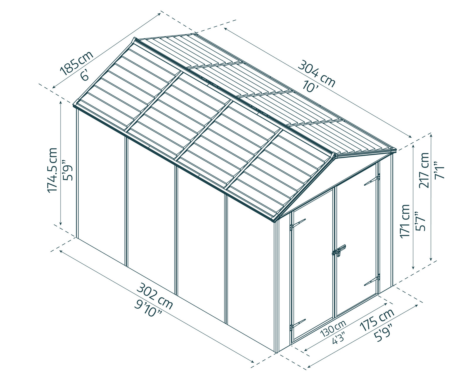 Discover the Canopia Rubicon Garden Shed, ultra-resistant and multifunctional. Made of shatterproof polycarbonate and reinforced aluminum, it offers years of maintenance-free protection. Natural lighting is provided by the skylight roof panels, maintaining privacy. Resistant to extreme weather conditions, humidity, fungal decay and termites. Easy to assemble, with non-slip floor included. Dimensions: 303x185x217 cm. An ecological product, 100% recyclable.