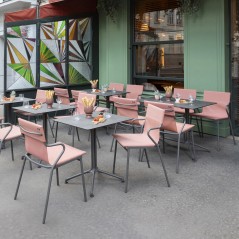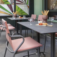For its furniture line dedicated to cafés, hotels and restaurants, LAFUMA MOBILIER collaborated with the BIG-GAME design studio. The HORIZON collection is the alliance between "smart design", comfort, style and functionality. It is available in 4 format tops to adapt to all terraces of cafés, hotels and restaurants: square 59 x 59 cm, square 69 x 69 cm, rectangular 115 x 69 cm and round Ø69 cm. In addition to the tops, the legs of the HORIZON tables are equipped with patented handles and elastomer cushioning systems that accompany the closing/opening movements for greater comfort of use. The legs are available in 2 versions: simple and double and 3 heights: standard, medium and high. This compact HPL stratified top, measuring 115 x 69 cm, allows you to comfortably seat 4 diners.