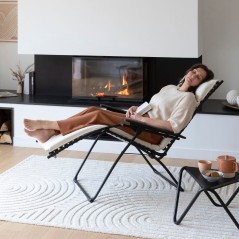 The **Niksen Evolution Grey Ash / Tube Black Zero Gravity Padded Relax Chair** combines ultra-enveloping comfort thanks to the three-layer padded loop pile fabric with the famous **“Zero Gravity” position** which places the legs slightly above the heart for deep relaxation; it features a **Ø20 mm ALE steel frame** with UV-resistant paint, a suspension system using **Lafuma patented elastomer clips** for even weight distribution, ergonomic resin armrests, an integrated and adjustable headrest and effortlessly fluid multi-positions, making it ideal for moments of relaxation at home or in the living area.