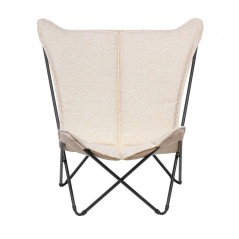 The **Sphinx Niksen Beige Crème / Tube Noir large padded butterfly chair** is a soft and enveloping reinterpretation of the classic Pop‑Up armchair, with a high back and three-layer padded bouclé fabric that invites relaxation and quiet; the **ALE Ø16 mm** steel frame is sturdy and durable, while the umbrella-like closing system and removable padded fabric make it easy to move and maintain.