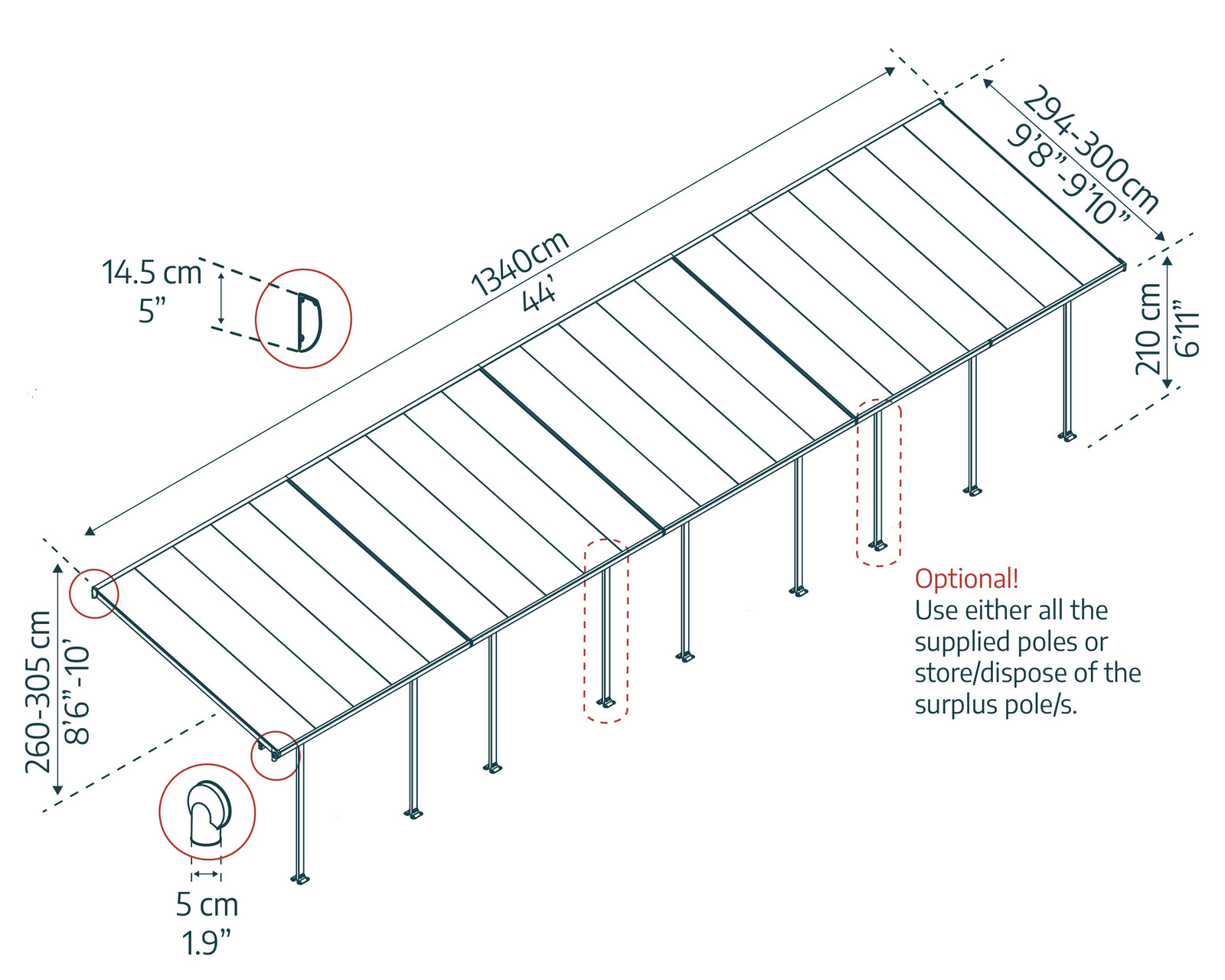 Discover the Canopia Feria Aluminum Attached Pergola 3X13.4 m Gray: the ideal solution for enjoying the outdoors in every season. Easy to assemble, durable and maintenance-free, it is perfect as a patio cover, carport, solarium or spa. The polycarbonate panels offer UV protection and 25% light transmission. Rust-resistant aluminum structure. Enjoy outdoor gatherings and barbecues without worrying about the weather. Buy now for a stylish and sturdy shelter.