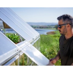 When we tell you that Palram - Canopia Balance greenhouse kits provide your plants with optimal conditions for nutrition and growth, we mean it. With two types of glazing, you get a balanced DIY greenhouse that combines the protection of diffuse double-wall roof panels with the light transmission of crystal-clear wall panels for ideal growing conditions. All panels are made of UV-protected polycarbonate, a high-end glass-like and virtually unbreakable polymer that is particularly suited to greenhouses. The extra-large working area gives you ample space to grow an abundance of vegetables and herbs and to store the tools and accessories you need. The Balance greenhouse is also extremely accessible with large double doors and a low threshold for wheelbarrows to enter and exit and enough space to transfer large plant boxes. The combination of the safe polycarbonate panels with the rust-resistant aluminum frame and extra strong support beams provides you with a well-designed and durable greenhouse, so you never have to worry about the strength or safety of your greenhouse. For a beautiful, well-designed and spacious addition to your gardening experience, purchase a Balance backyard greenhouse today! - Polycarbonate: 100% UV protected, virtually shatterproof and will not yellow or become brittle over time