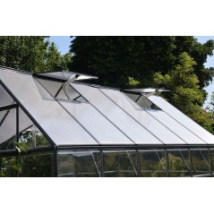 This wonderful T-shaped Victory Orangery Chalet greenhouse is perfect for use in spring and autumn, providing enough space for gardening all year round. The greenhouse has ample floor space and high ceiling for tall growing or climbing plants. The greenhouse requires no maintenance and is easy to assemble. It has gutter with outlets to collect water and easy to install sliding panels.