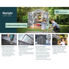 The Palram - Canopia SkyLight Shed is ideal for storing, organizing and protecting all your outdoor gear. The Palram - Canopia's virtually indestructible polycarbonate and reinforced aluminum frame construction means that the SkyLight Shed will be maintenance-free for years to come. The panels may not seem optimal in terms of flexibility and thickness at first, but once assembled the shed will be rigid and durable. The SkyLight's unique polycarbonate roof panels let sunlight in throughout the day, while maintaining just the right amount of exterior opacity to maximize privacy. Front and back vents improve air circulation. Palram - Canopia SkyLight Sheds are built to last - they won't break, bend or fade. Resistant to adverse weather conditions, such as hail or high temperatures. Designed to meet the demands of the outdoors, the SkyLight Shed enhances your home and outdoor space.