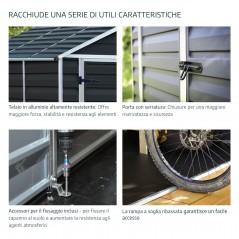 Discover the Canopia Skylight Polycarbonate Garden Shed, perfect for organizing and protecting your outdoor items. Indestructible structure with reinforced aluminum frame, does not require maintenance. The roof panels transmit natural light, ensuring privacy. Resistant to adverse weather conditions, it is equipped with ventilation fans and a lockable door. Easy to assemble, 100% recyclable and anchorable on a solid surface. Dimensions: 303x185x217 cm.