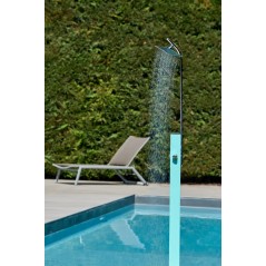 Triangular outdoor shower for surface installation, complete with adjustable anti-limescale shower head, manual mixer for hot and cold water, stainless steel mounting base and screws. Available in four colors.