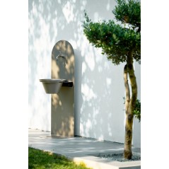 Fontaine décorative en acier apparente avec grille d'écoulement, équipée d'une grande douchette anticalcaire réglable, d'un mitigeur manuel pour eau chaude et eau froide, d'un socle en acier inoxydable et de la quincaillerie. Disponible en quatre coloris. Dimensions du pot : 32 x 32 x 16 cm (L x l x H).