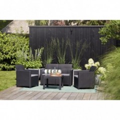 Ensemble d'extérieur composé de : 1 canapé deux places, 2 fauteuils et 1 table basse.