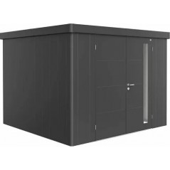The slightly darkened acrylic glass panel, applied to the standard door, gives the Biohort Neo garden shed even more character.