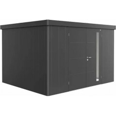 The slightly darkened acrylic glass panel, applied to the standard door, gives the Biohort Neo garden shed even more character.