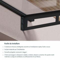 Meet the Sophia XL Outdoor Canopy by Canopia: modern design and advanced functionality for your home. Made of durable aluminum and clear acrylic panels, it offers extended, weather-resistant protection. Perfect for your entryway, windows or garage, it can be installed seamlessly for an extendable coverage. Easy to install, wind and snow resistant, blocks 100% of UV rays. 3-year warranty included. Elevate your outdoor space with Canopia.