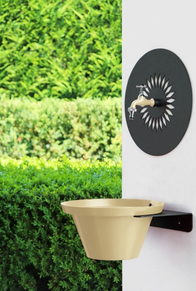 Fontana ornamentale da parete composta da vaso lavamani estraibile in alluminio verniciato, rubinetto in ottone cromato e verniciato in tinta e profilo metallico a taglio laser verniciato a polveri poliestere antigraffio. Inclusi supporto per vaso e viteria. Disponibile in 4 colori.