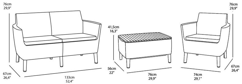 Set composto da: 1 Divano a 2 posti, 2 Poltrone ed un Tavolino contenitore.