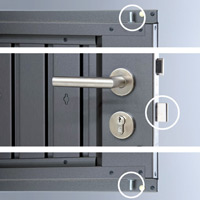 Serratura a 3 punti di chiusura, compreso il cilindro standard impediscono l'accesso indesiderato. Realizzazione particolarmente robusta. Arresto porta: destra