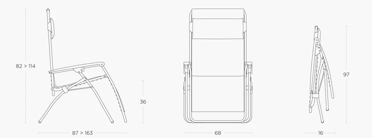 - Sospensioni: i tubi in acciaio e la tela sono collegati mediante clip in elastomero. Questo sistema brevettato Lafuma vi offrirà un comfort piùfermo, un buon sostegno per la schiena, montaggio/smontaggio semplificati della tela e una grande resistenza.