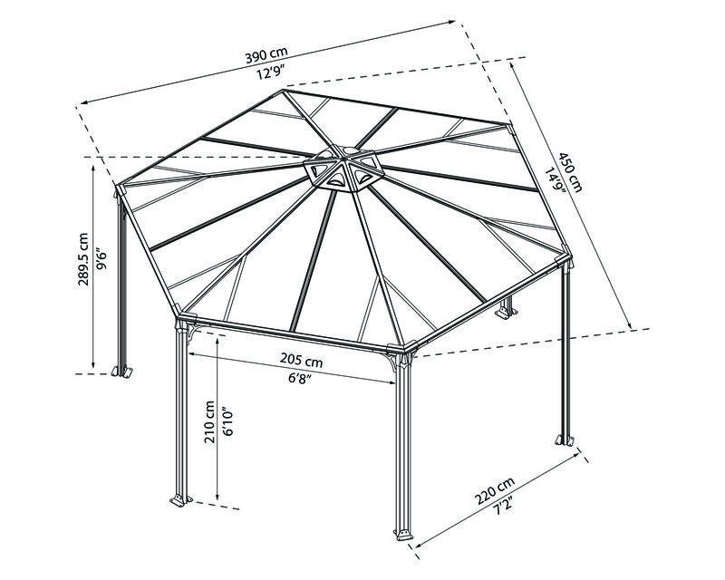 Scopri il Gazebo Esagonale Monaco di Canopia: elegante e resistente, è l'ideale per godere del tuo spazio esterno tutto l'anno. Realizzato in alluminio e policarbonato, protegge da raggi UV, grandine e neve. Facile da installare, non necessita di manutenzione e resiste a condizioni meteo avverse. Perfetto per organizzare eventi, fare barbecue o rilassarsi in una vasca idromassaggio. Dimensioni: 390x450x289.5 cm.