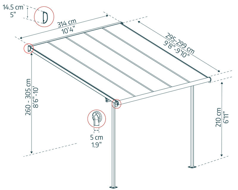 Valorizzate il vostro spazio esterno con la copertura per patio Palram - Canopia Sierra, una soluzione di copertura esteticamente gradevole e versatile. Godetevi il vostro spazio all'aperto tutto l'anno con questa aggiunta elegante e robusta. Godetevi le riunioni di famiglia e i barbecue senza preoccuparvi che il tempo capriccioso possa rovinare il vostro divertimento. Sierra è una soluzione estetica, versatile e priva di manutenzione, adatta a una varietà di applicazioni esterne, come tende da sole per balconi o patio, lettini, tende per porte, ecc.Sierra è una struttura di posizionamento potente e flessibile che consente di impostare l'altezza desiderata all'attacco della parete, la distanza dalla casa e tra i pali ovali frontali. È progettata per essere facilmente assemblata da 2 persone, con il sistema di pannelli scorrevoli che garantisce un montaggio facile e sicuro; non richiede esperienza, né abilità particolari, né strumenti speciali. Sierra offrirà alla vostra famiglia uno spazio di vita all'aperto elegante, robusto e privo di ruggine per gli anni a venire.