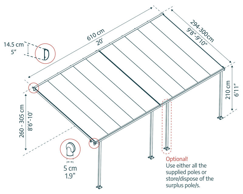 Godetevi la vita all'aperto con la copertura per patio Palram - Canopia Feria. Utilizzate questa copertura estetica e priva di manutenzione come copertura per patio, tettoia, solarium o spa: date libero sfogo alla vostra immaginazione. Godetevi le riunioni di famiglia e i barbecue senza lasciare che il tempo capriccioso rovini il divertimento. Questa struttura ad alte prestazioni è progettata per essere facilmente assemblata da due persone, utilizzando il sistema di copertura Click N' Lock per un montaggio facile e sicuro, che blocca le vetrate tra le barre della struttura e impedisce all'acqua di entrare nelle vetrate. Non richiede esperienza, né competenze o strumenti particolari. Feria offre alla vostra famiglia un riparo elegante, robusto e privo di ruggine per gli anni a venire.