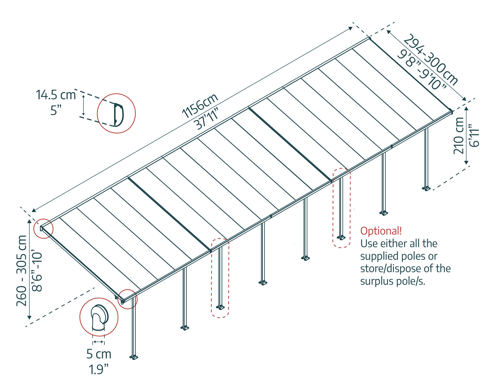 Scopri la Pergola Addossata Canopia Feria in Alluminio 3X11.56 m Grigio, la soluzione perfetta per godere dell'aria aperta in ogni stagione. Facile da montare, resistente e senza manutenzione, offre un rifugio elegante e robusto per il tuo patio o spa. I pannelli in policarbonato multistrato bianco da 8 mm offrono una protezione UV completa, mentre la struttura in alluminio pesante è resistente alla ruggine. Goditi riunioni di famiglia e barbecue senza preoccuparti del tempo. Ordina ora la tua Pergola Canopia Feria!