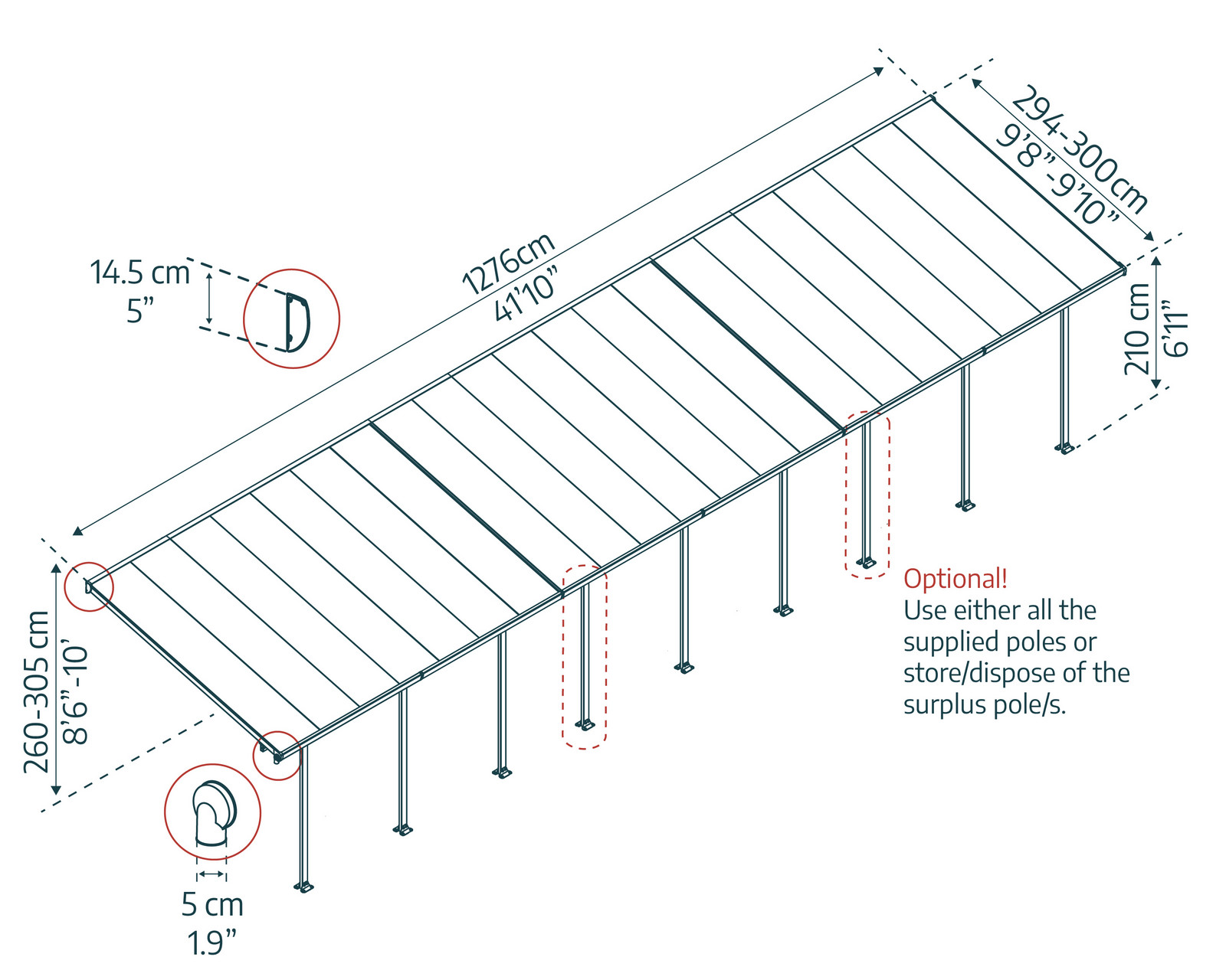 Scopri la Pergola Addossata Canopia Feria in Alluminio 3X12.7 m Grigio, la soluzione perfetta per godere dell'aria aperta in ogni stagione. Facile da montare, resistente e senza manutenzione, offre un rifugio elegante e robusto per il tuo patio o spa. I pannelli in policarbonato multistrato offrono protezione UV completa, mentre la struttura in alluminio resistente alla ruggine garantisce durata nel tempo. Con il sistema di grondaie integrato e il kit di ancoraggio incluso, la tua Pergola Canopia è pronta per resistere a tutte le condizioni climatiche.
