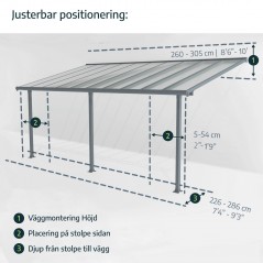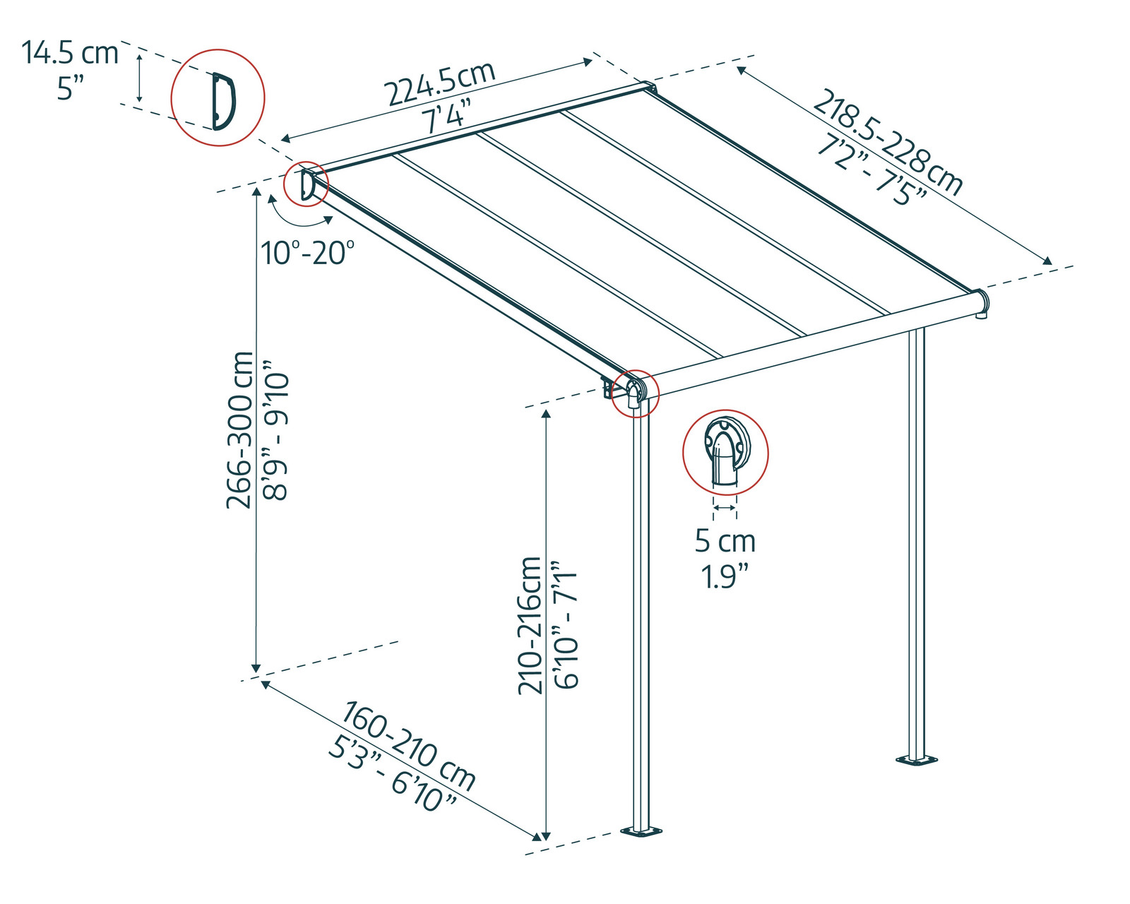 Valorizzate il vostro spazio esterno con la copertura per patio Palram - Canopia Sierra, una soluzione di copertura esteticamente gradevole e versatile. Godetevi il vostro spazio all'aperto tutto l'anno con questa aggiunta elegante e robusta. Godetevi le riunioni di famiglia e i barbecue senza preoccuparvi che il tempo capriccioso possa rovinare il vostro divertimento. Sierra è una soluzione estetica, versatile e priva di manutenzione, adatta a una varietà di applicazioni esterne, come tende da sole per balconi o patio, lettini, tende per porte, ecc.Sierra è una struttura di posizionamento potente e flessibile che consente di impostare l'altezza desiderata all'attacco della parete, la distanza dalla casa e tra i pali ovali frontali. È progettata per essere facilmente assemblata da 2 persone, con il sistema di pannelli scorrevoli che garantisce un montaggio facile e sicuro; non richiede esperienza, né abilità particolari, né strumenti speciali. Sierra offrirà alla vostra famiglia uno spazio di vita all'aperto elegante, robusto e privo di ruggine per gli anni a venire.