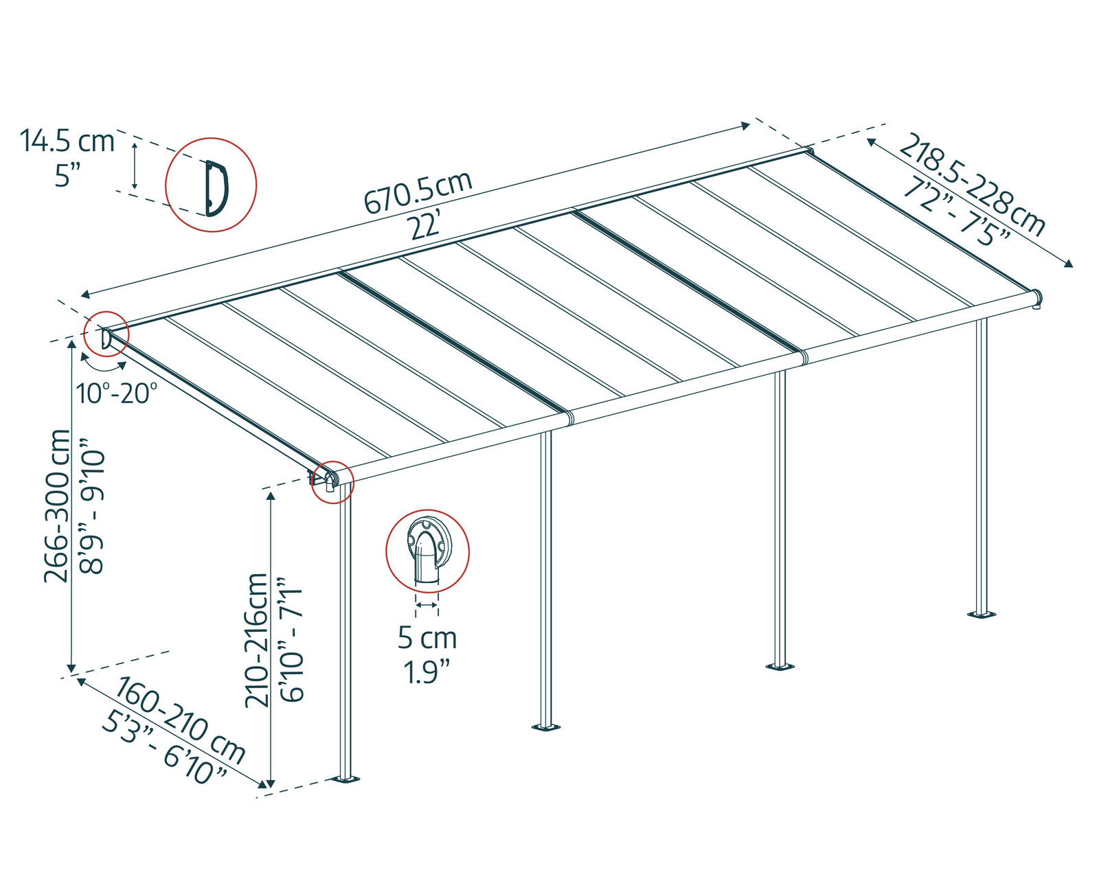 Valorizzate il vostro spazio esterno con la copertura per patio Palram - Canopia Sierra, una soluzione di copertura esteticamente gradevole e versatile. Godetevi il vostro spazio all'aperto tutto l'anno con questa aggiunta elegante e robusta. Godetevi le riunioni di famiglia e i barbecue senza preoccuparvi che il tempo capriccioso possa rovinare il vostro divertimento. Sierra è una soluzione estetica, versatile e priva di manutenzione, adatta a una varietà di applicazioni esterne, come tende da sole per balconi o patio, lettini, tende per porte, ecc.Sierra è una struttura di posizionamento potente e flessibile che consente di impostare l'altezza desiderata all'attacco della parete, la distanza dalla casa e tra i pali ovali frontali. È progettata per essere facilmente assemblata da 2 persone, con il sistema di pannelli scorrevoli che garantisce un montaggio facile e sicuro; non richiede esperienza, né abilità particolari, né strumenti speciali. Sierra offrirà alla vostra famiglia uno spazio di vita all'aperto elegante, robusto e privo di ruggine per gli anni a venire.